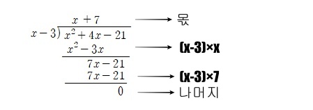 풀이식은 자연수를 나눗셈하는 것과 거의 동일합니다. 자연수에서 나머지가 나누는 수보다 작아야 하듯 다항식의 나눗셈에서도 나머지의 차수가 나누는 다항식의 차수보다 반드시 낮아야 합니다. 나머지가 나누는 숫자보다 크면 몫으로 들어갈 부분이 남아 있는 것이기 때문입니다.