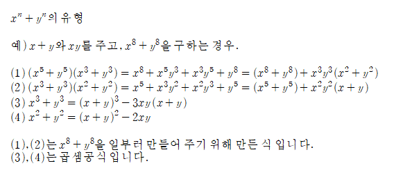 위 유형의 경우 (1), (2) 식은 재료 x+y와 xy만 있으면 풀 수 있게 하기 위해 8차식을 일부러 만들어 준 것입니다. +로 연결된 식을 곱해 만들어 주면 결국 재료는 주어진 x+y, xy를 통해 충분히 전부 만들어 낼 수 있습니다.